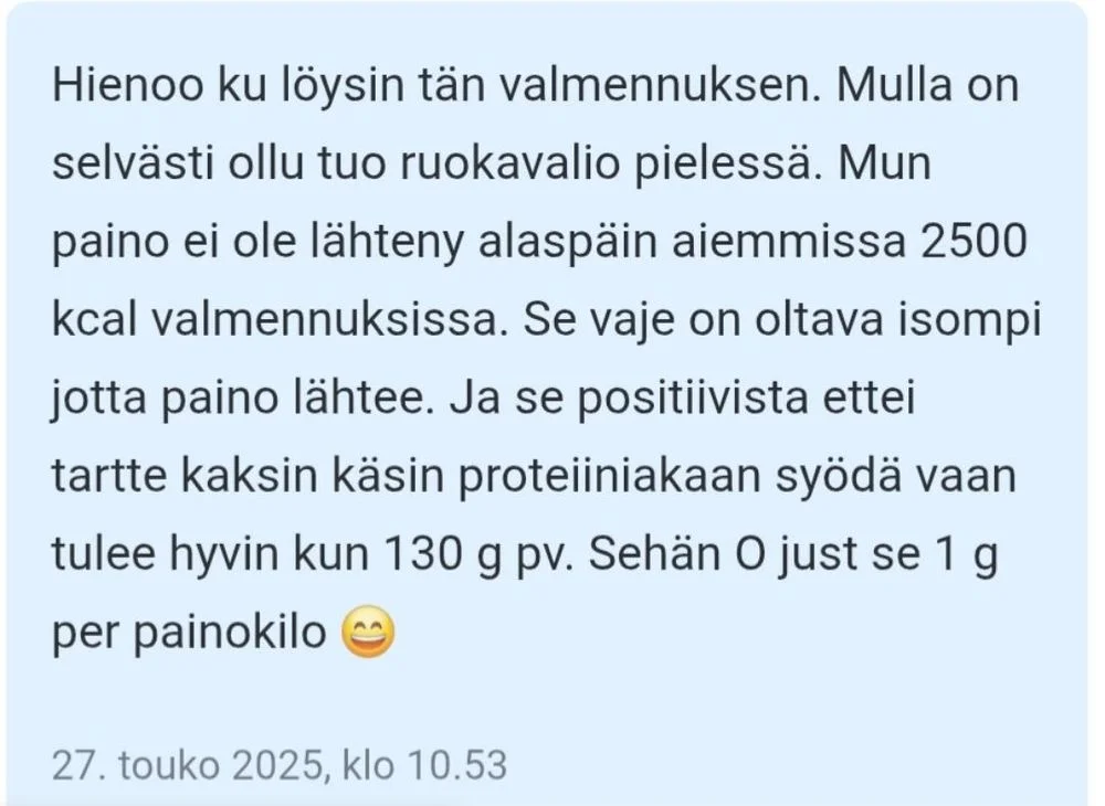 Mukana tulee reseptipankki, käytännönläheiset videot, valmentajan henkilökohtainen tuki ja inspiroiva yhteisö. Lahjakortti sopii: Henkilölle, joka haluaa pudottaa painoa turvallisesti ja pysyvästi Hänelle, joka on kyllästynyt jojotteluun tai tehottomiin kokeiluihin Kenelle tahansa, joka kaipaa helpompaa tapaa voida paremmin ja näyttää hyvältä Lahjakortti toimitetaan sähköisesti heti tilauksen jälkeen. Lahjansaaja voi käyttää sen seuraavassa alkavassa valmennuksessa itselleen sopivana ajankohtana.