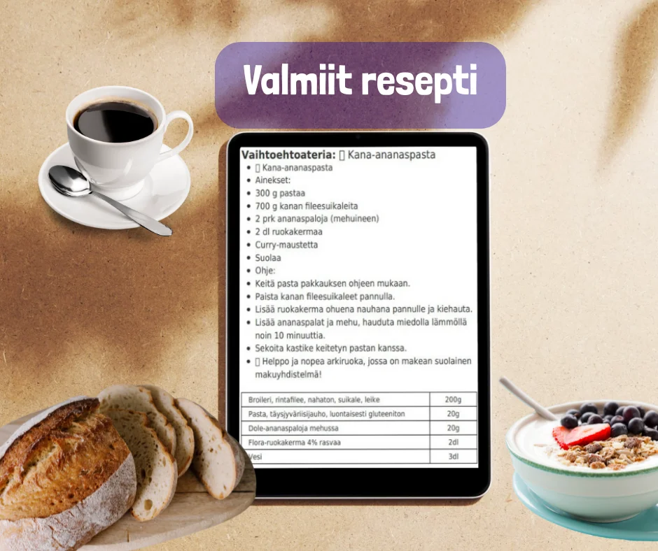 Reseptipankki (2–3 vaihtoehtoa jokaiselle aterialle) Videot terveellisten aterioiden rakentamisesta Kokkivideot helppoihin ja nopeisiin ruokiin Vinkit mielitekojen hallintaan ja iltanapostelun välttämiseen Henkilökohtainen viestituki valmentajalta Ryhmätuki ja mahdollisuus osallistua yhteisiin kokkailuihin