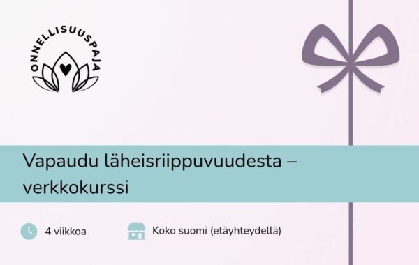 Lahjakortti antaa sinulle tai läheisellesi paikan Vapaudu läheisriippuvuudesta – astu omaan voimaasi ja aseta terveet rajat! -verkkokurssille. Oletko kyllästynyt elämään muiden kautta, miellyttämään ja mukautumaan omien tarpeidesi kustannuksella? Onko vaikea asettaa rajoja tai tunnistaa tunteitasi? Tällä kurssilla sinun on mahdollista saada kestävät työkalut näistä toimintamalleista ja siten läheisriippuvuudesta toipumiseen. Muutos on mahdollinen – ja se alkaa tiedostamisesta, hyväksymisestä ja lempeydestä itseäsi kohtaan.